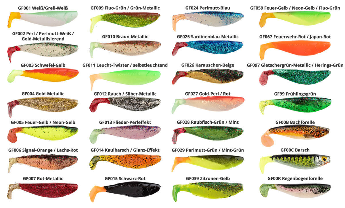 Gummifische gibt es unzählige. Der ATTRACTOR von Profi-Blinker stellt aber hier eine Ausnahme dar. Die verwendete Gummimischung ist in jahrelanger Entwicklung und mit vielen Erfahrungstests ausgewählt und speziell für Profi-Blinker zusammengestellt worden. Wer einmal einen ATTRACTOR berührt und mit ihm gefischt hat, der wird verstehen, weshalb er so genial ist. Viele Hersteller verwenden hier Weichmacher und billiges Silikon. Öffnet man solche Kunstköderverpackungen weht einem die Chemiekeule um die Nase. Ganz anders beim dem Profi-Blinker-ATTRACTOR. Ein spezielle Ölmischung schützt den Körper des Kunstköders. Man möchte ja ein köderfischähnliches Gefühl und Verhalten für den Zielfisch erreichen. Damit ist der ATTRACTOR im trockenen Zustand leicht klebrig. Das Öl verhindert beim Lagern und Transport, auch in Ihrer Angeltasche die Beschädigung durch Verklebung. Der verwendete Schutzfilm ist natürlich umweltfreundlich. Die Gussformen und damit die Formgebung ist auch ein weiteres Alleinstellungsmerkmal. Im Vergleich zu preiswerteren Plagiaten sind die ATTRACTOR von Profi-Blinker als absolut hochwertig einzuschätzen. Dies ist der Grund für die perfekten Laufeigenschaften und diese sind maßgeblich für die hohe Fängigkeit. Die umfangreichen Farb- und Modellvarianten, erhältlich in 11 Größen und über 20 verschiedene Farben, sind ein weiterer Punkt. Möchten Sie es auffällig - für trübe stehende Gewässer oder dezent - bei Profi-Blinker haben Sie die Wahl. Auch Imitation von reellen Fischfarben sind zu haben. Barsch, Kaulbarsch, Zander, Schleie, Bach- und Regenbogenforelle sind hier zu nennen.