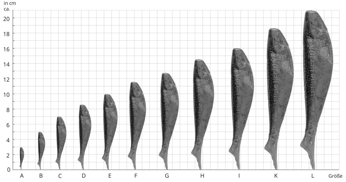 Bei allen diesen Lösungen handelt es sich um einen Haken, an dem sich kopfseitig ein eingegossenes Gewicht in der jeweiligen Form/Funktion befindet. Wichtig ist dabei, dass der Haken circa den halben Körper des ATTRACTORs durchdringen sollte. Sitzt der Jighaken zu weit hinten, verhindert er das Wedeln des Schwanzes und hemmt die reizende Bewegung des ATTRACTOR. Sitzt der Haken zu weit vorn, riskiert man Fehlbisse bzw. der Haken wird von Zielfisch nicht aufgenommen. Profi-Blinker hat alle Gummifischköder in Größen von A bis L klassifiziert und damit lässt sich die Größe des Jig-Hakens sehr leicht kombinieren. Alle Jig-Haken haben ebenfalls eine A bis L Größenklassifizierung und somit braucht man nur jeweils denselben Code zu bestellen.