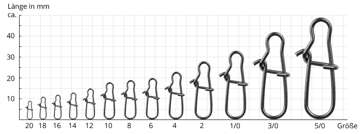 Wählen Sie passend zum Zielfisch, die entsprechende Größe und Tragkraft des Wirbels aus. So benötigen Sie, bei größeren Fischen auch mehr Tragkraft und beim Meeresangeln widerstandsfähige Einhängewirbel aus Edelstahl. Die Angabe der Größe bei Wirbel-Karabinern bedeutet für Angler, dass die Größe 2 größer ist, also eine höhere Tragkraft besitzt, als die Größe 4 und so weiter.