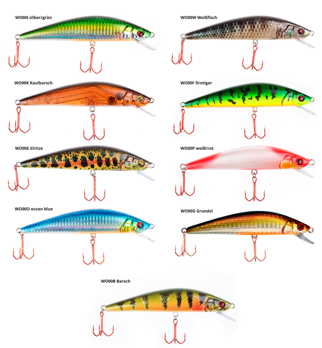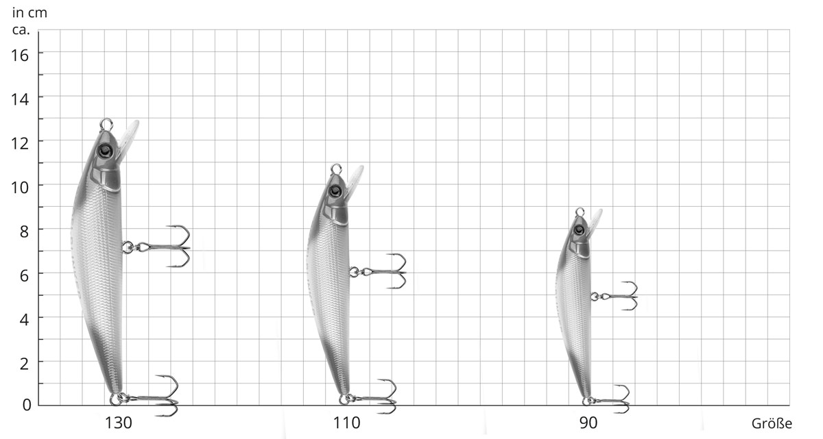 Die Wobbler werden in 9, 11 und 13 cm Länge (ohne Tauchschaufel gemessen) jeweils in 9 Farben angeboten.