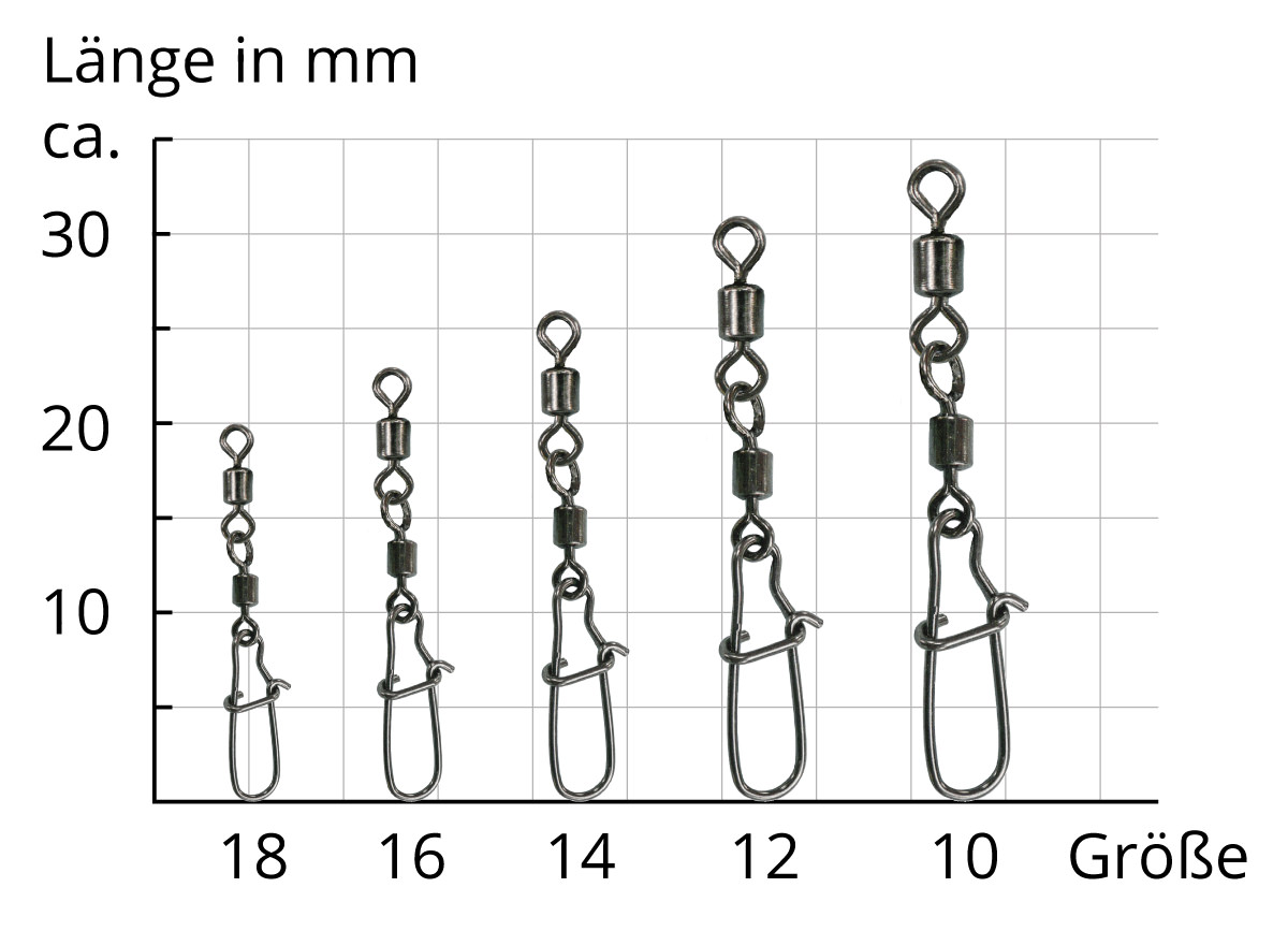 Wählen Sie passend zum Zielfisch, die entsprechende Größe und Tragkraft des Wirbels aus. So benötigen Sie, bei größeren Fischen auch mehr Tragkraft und beim Meeresangeln widerstandsfähige Einhängewirbel aus Edelstahl. Die Angabe der Größe bei Wirbel-Karabinern bedeutet für Angler, dass die Größe 2 größer ist, also eine höhere Tragkraft besitzt, als die Größe 4 und so weiter.