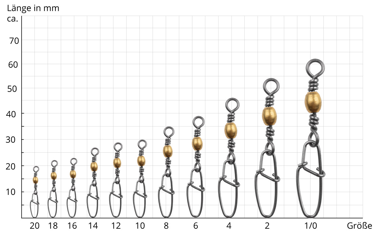 Wählen Sie passend zum Zielfisch, die entsprechende Größe und Tragkraft des Wirbels aus. So benötigen Sie, bei größeren Fischen auch mehr Tragkraft und beim Meeresangeln widerstandsfähige Einhängewirbel aus Edelstahl. Die Angabe der Größe bei Wirbel-Karabinern bedeutet für Angler, dass die Größe 2 größer ist, also eine höhere Tragkraft besitzt, als die Größe 4 und so weiter.