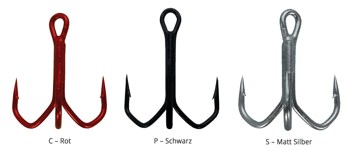 - eckiger Hakenbogen mit kurzem Schaft sorgt gegenüber der O’Shaughnessy Form von Standard-Drillingen für bessere Laufeigenschaften bei schlanken Wobblern und verhindert Aussteiger