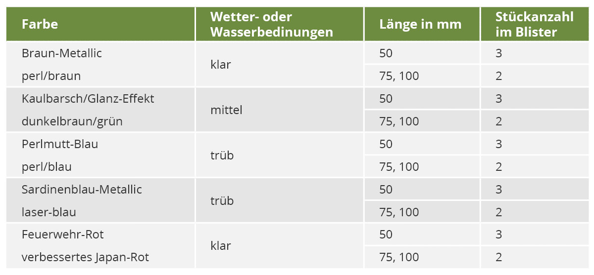 Als erstes wird im Wasser das rote langwellige Licht absorbiert. Rote Köder verlieren unter Wasser als erstes die Farbkraft. Es folgen Orange, Gelb, Grün, Blau und schließlich Violett. Mit Abstand am weitesten dringen ultraviolette kurzwellige Strahlen in das Wasser. Die kurzwelligen Farben und fluoreszierende Köder sind auch bei schlechtesten Lichtverhältnissen noch lange als Farbe wahrnehmbar. Selbstleuchtende Köder (glow in the dark) funktionieren in extremen Tiefen und in der Nacht.